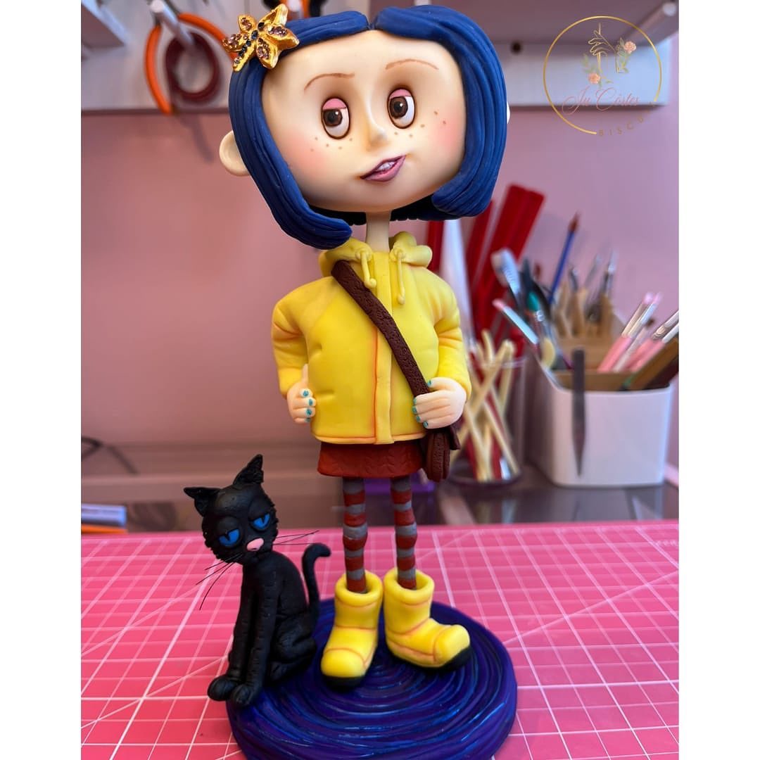 Doll personalizada com cabelo loiro cacheado, vestido azul marinho de tule com coraçõezinhos brancos, sapatilha e seu pet Yorkshire ao lado. Encomenda especial para presentear quem ama estilo e seu melhor amigo de quatro patas.